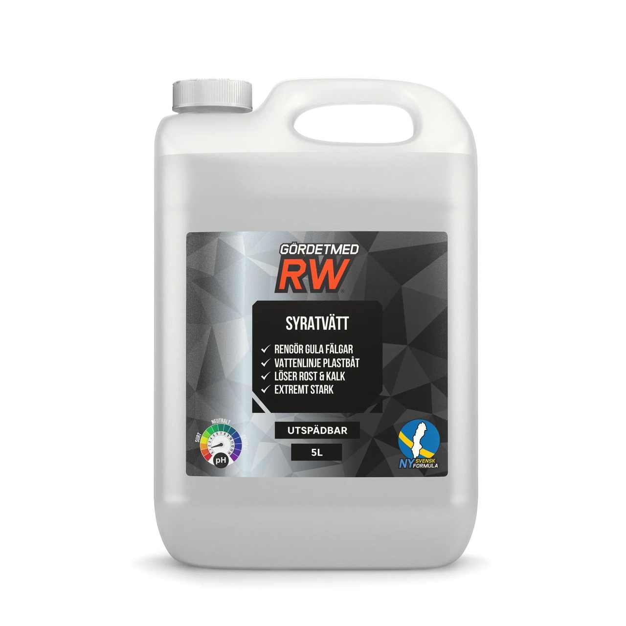 STARK SYRATVÄTT FÖR DEN MEST TJURIGA SMUTSEN! DENNA PRODUKT ÄR EJ AVSEDD FÖR DUSCHVÄGGAR ELLER BADRUM. Detta är en högkoncentrerad och mycket effektiv syratvätt som kan rengöra den mest tjuriga inbrända smutsen på aluminiumfälgar. Fungerar även mycket bra för rengöring av den gula vattenlinjen på gelcoatbåtar/plastbåtar. Fungerar till mycket annan rengöring men vi rekommenderar dig att ALLTID först prova på en liten yta först för att se hur den reagerar med ytan. Levereras med lös trigger.Specifikation