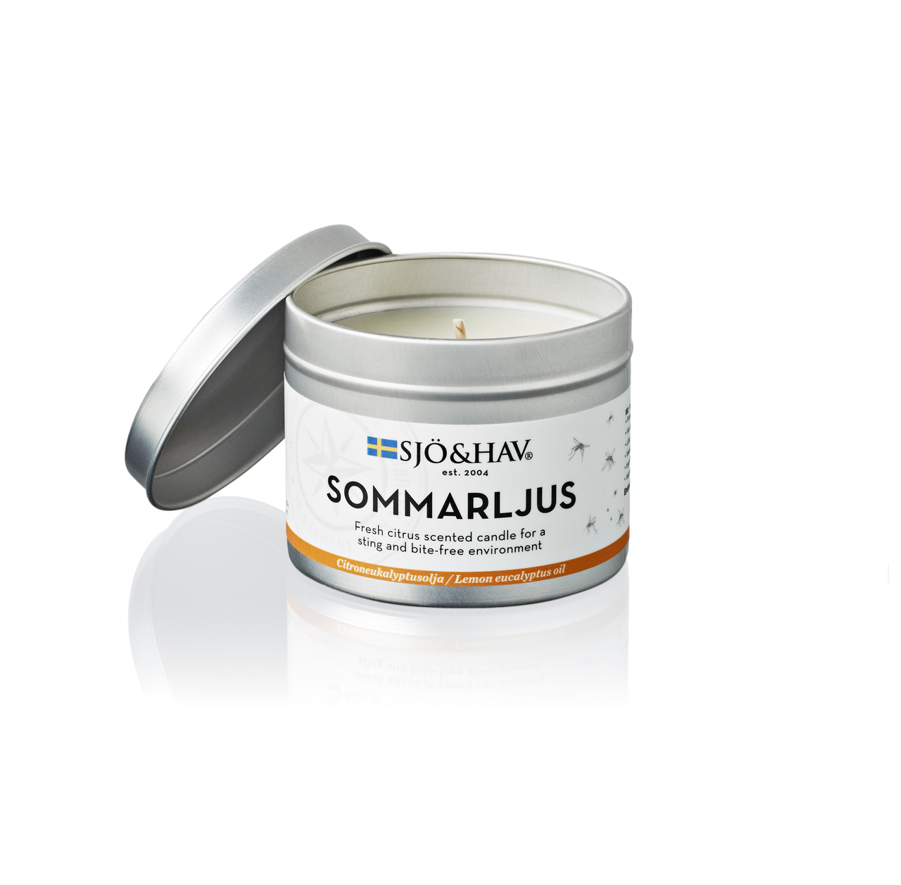 Handgjort Sommarljus i återvinningsbar aluminiumburk. Naturlig frisk doft av citrus som insekter inte uppskattar. Stick- och bitfri miljö i upp till 32 timmar. Lång brinntid för maximal effektivitet i upp till 32 timmar. Ljuset sotar ej. Parfymfri. Endast för utomhusbruk.Specifikation
